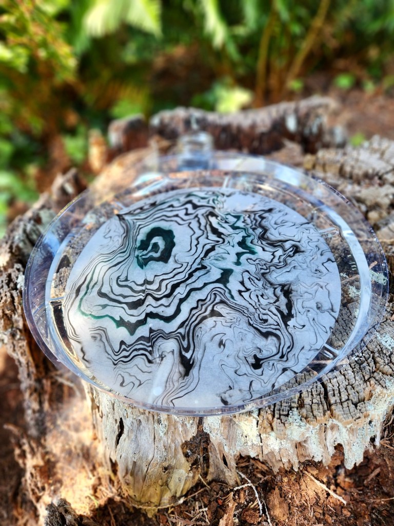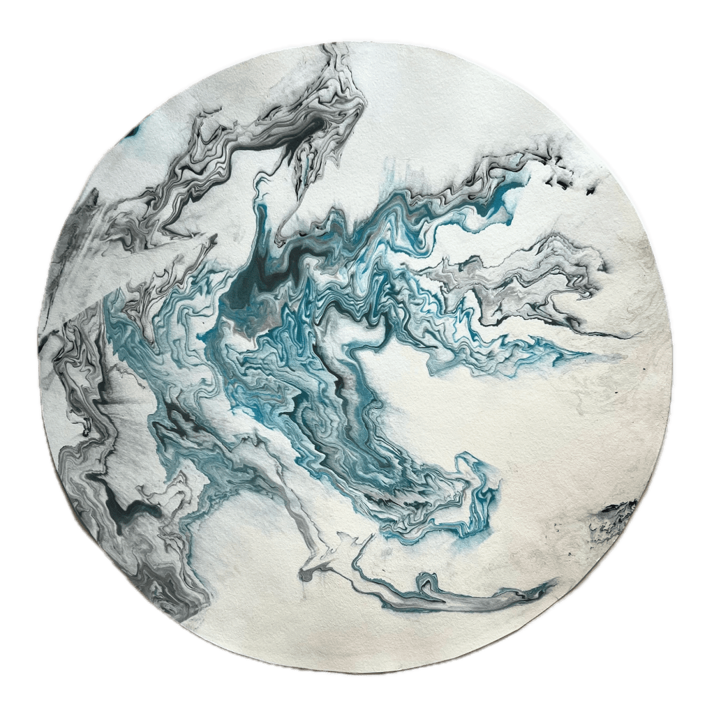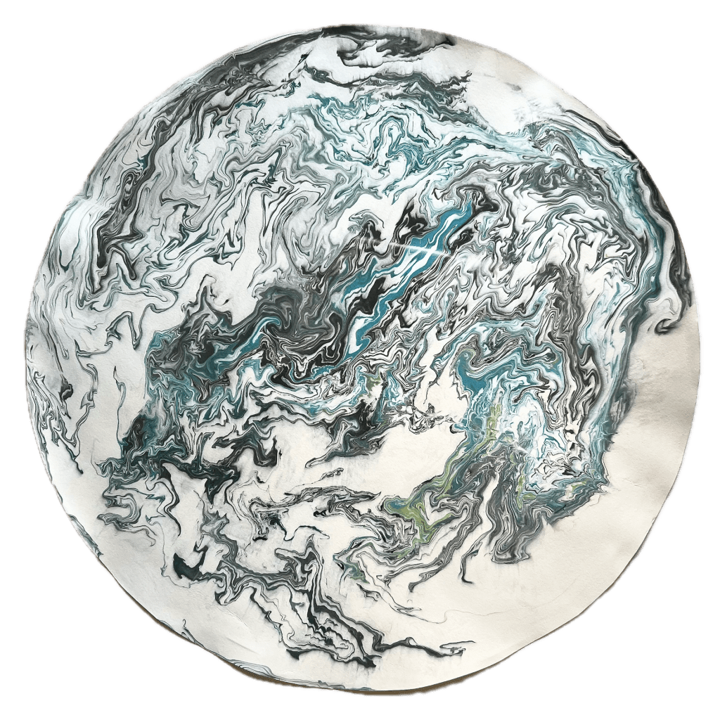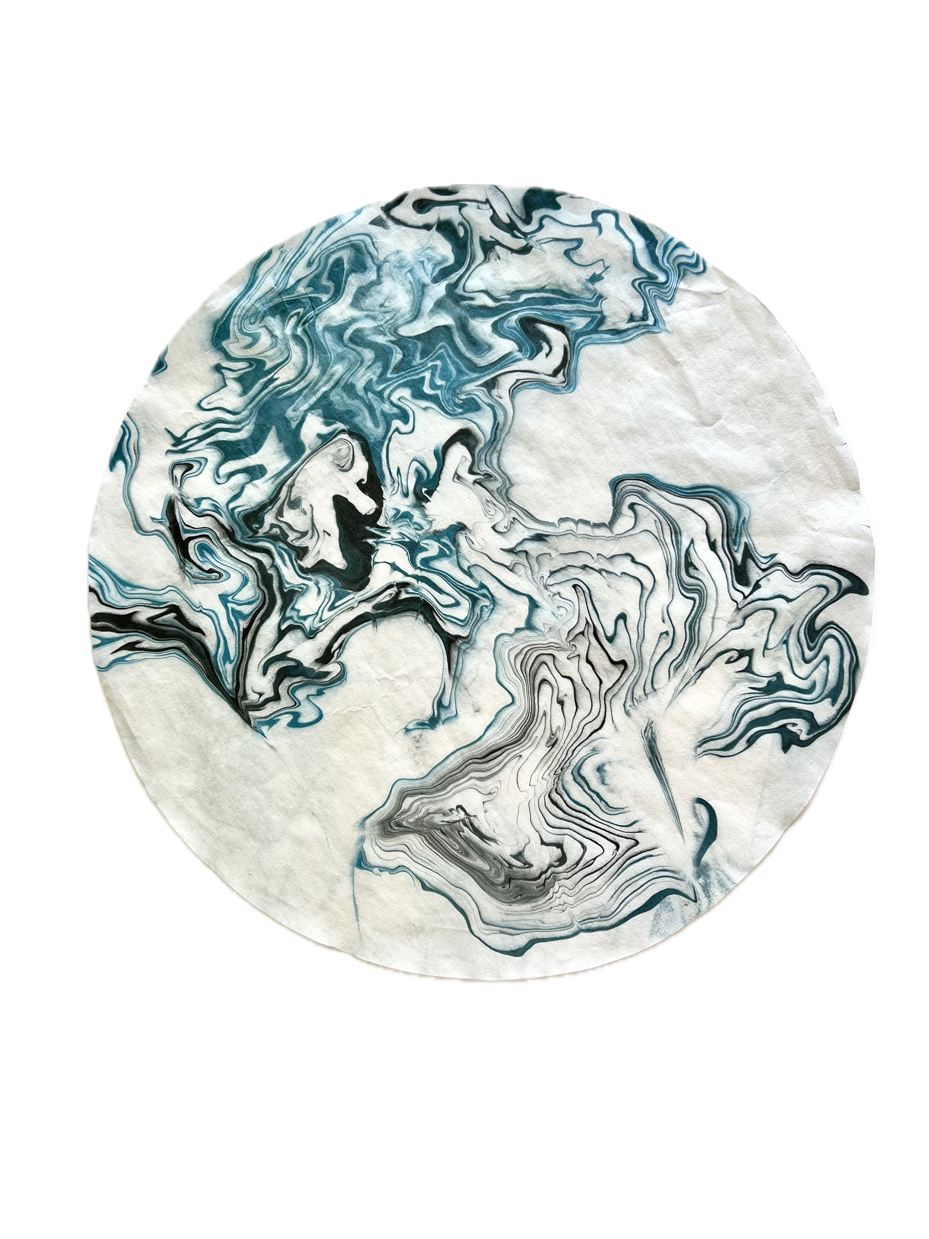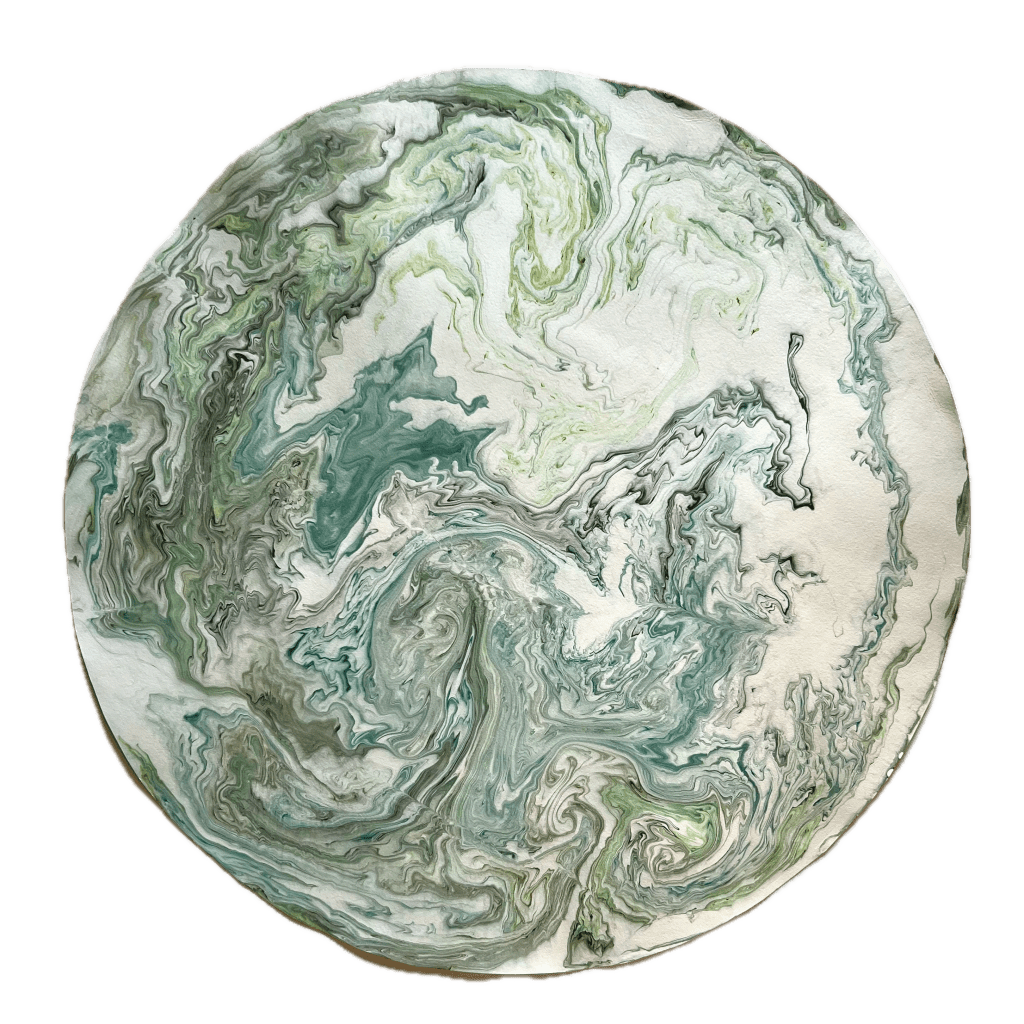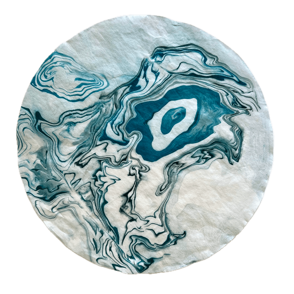 On blustery days, I work in the forest to capture these distinctive patterns of wind on water using a mind-body technique similar to an ancient art form. Suminigashi which translates to “floating ink”, was a process used in the meditation practice of monks in 12C Japan. I monoprint onto paper directly from the surface of unsettled rainwater after alternating coloured inks with bamboo brushes tips. I use this old way to be calm and present in my immediate surroundings while experiencing the atmospheric forces that impact plants .