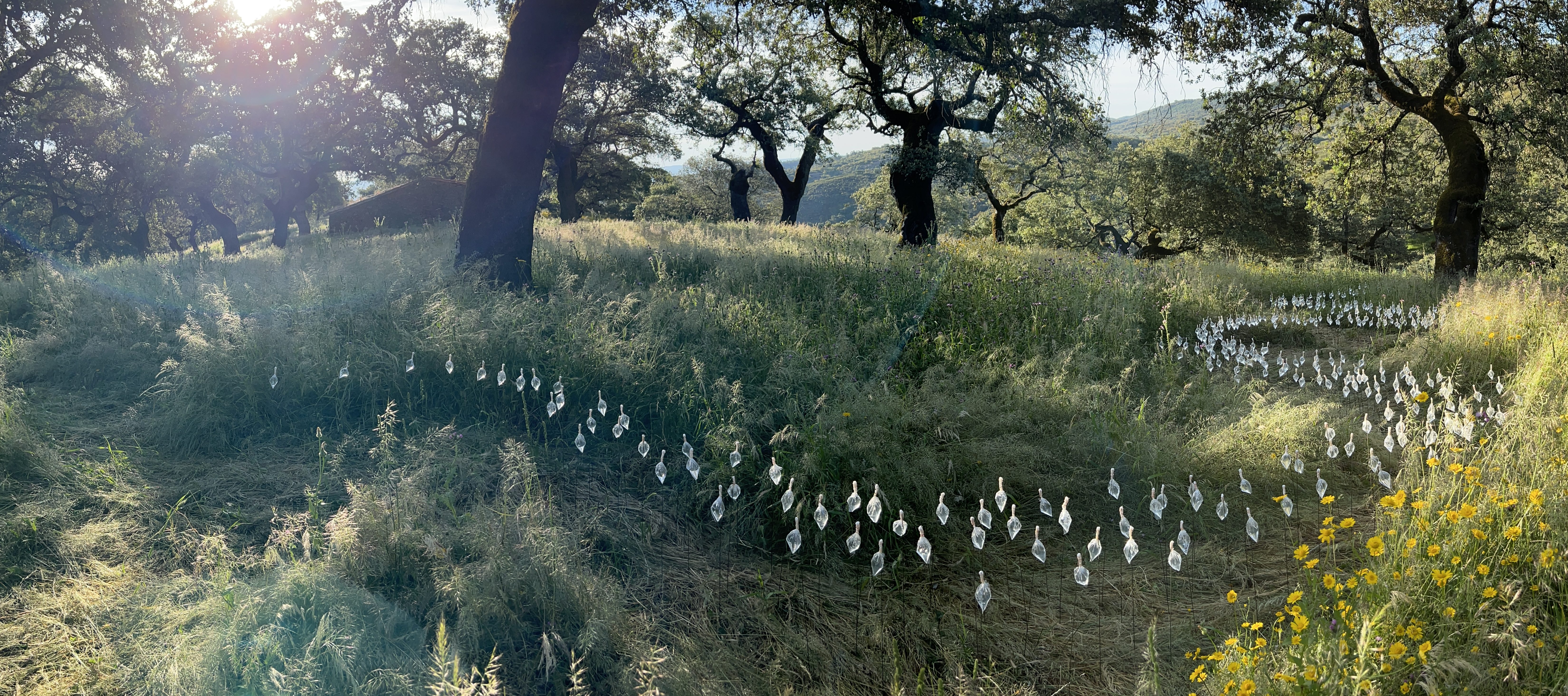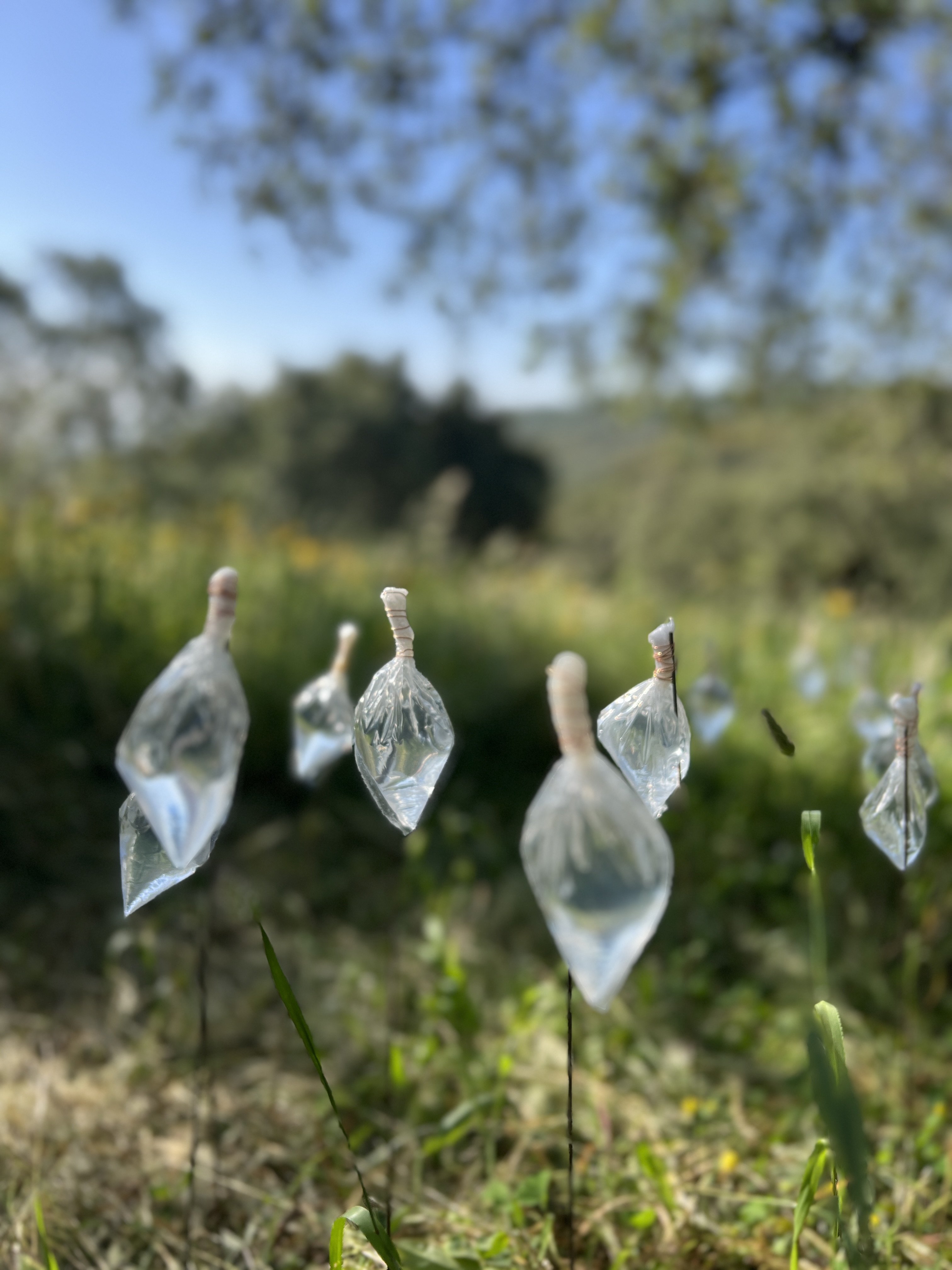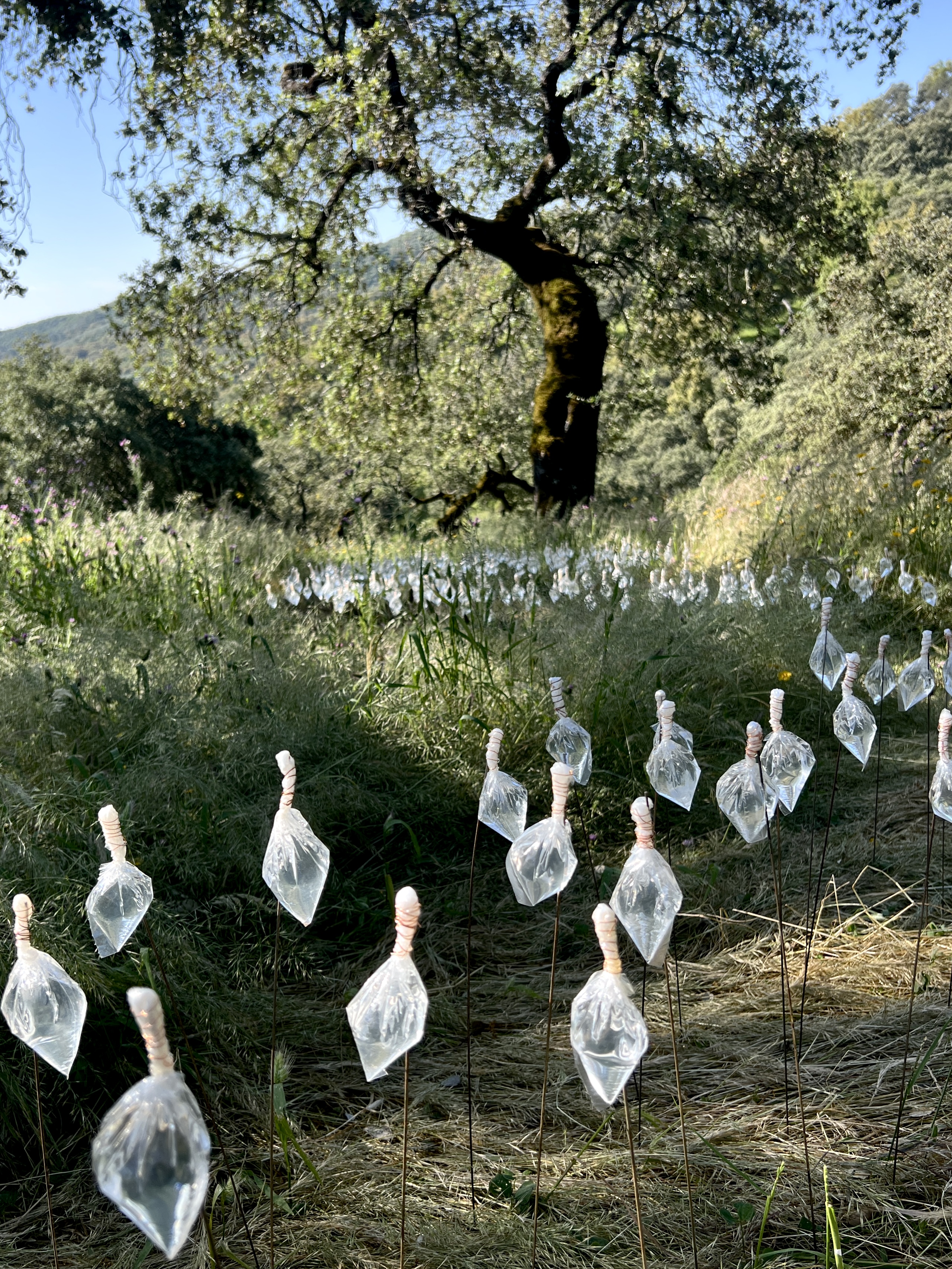 In the serene finca, sunlight illuminates water unnaturally held in suspension above iron-rich earth and wind-caressed grasses. Forming a meandering path similar to that of a natural creek, four hundred plastic bags keep water contained above soil, an interruption symbolic of water cycle imbalances caused by humans. The installation’s materiality reminds of the region’s extractive, contaminating industrial and agricultural practices that threaten water availability.