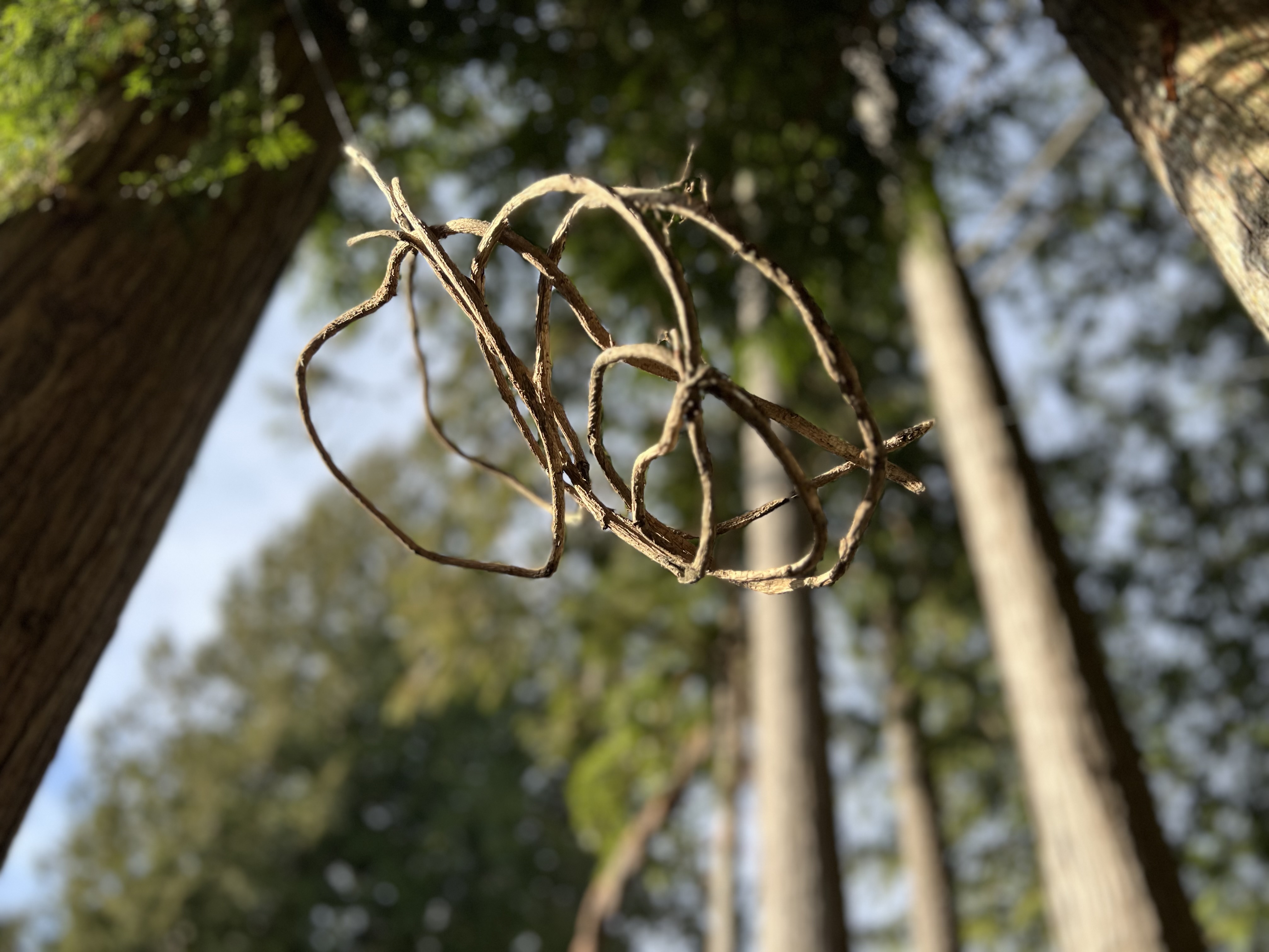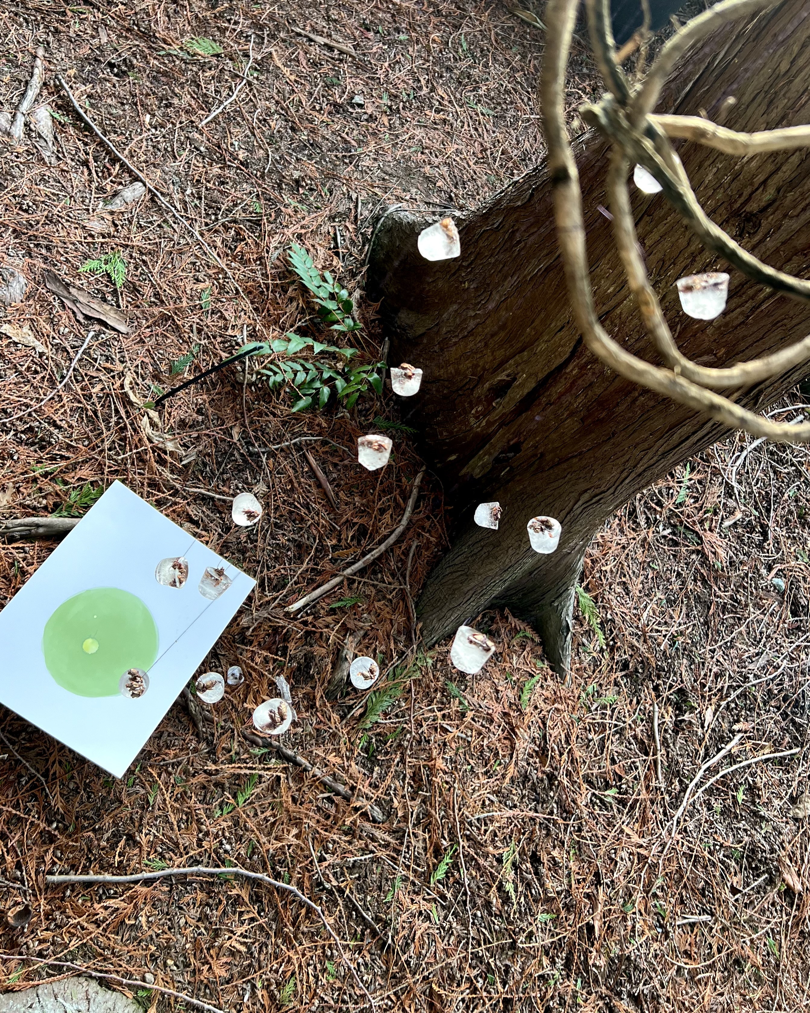 This location where I normally work is visually and spatially familiar but, today, it feels unexpectedly inert. Nothing is fluid. Leaves and twigs are rigid and branches drawn tense under the weight of black ice. My blood’s momentum shifts, I sense a deadlock, a loss of connection, a strange separateness. In response, I begin connecting. I attach threads, frozen rainwater and seeds to the trees as a way to restore what I felt had been paused.