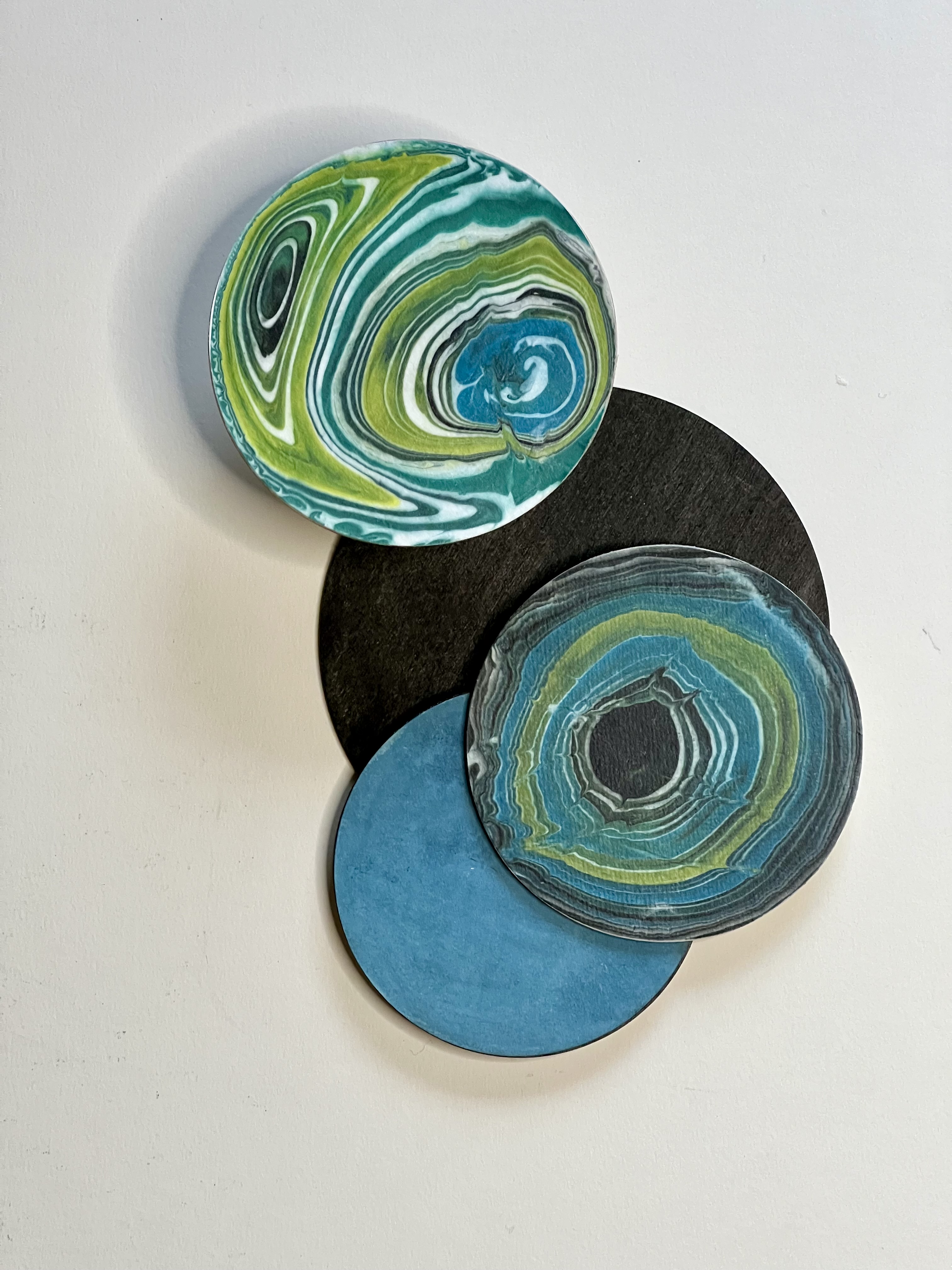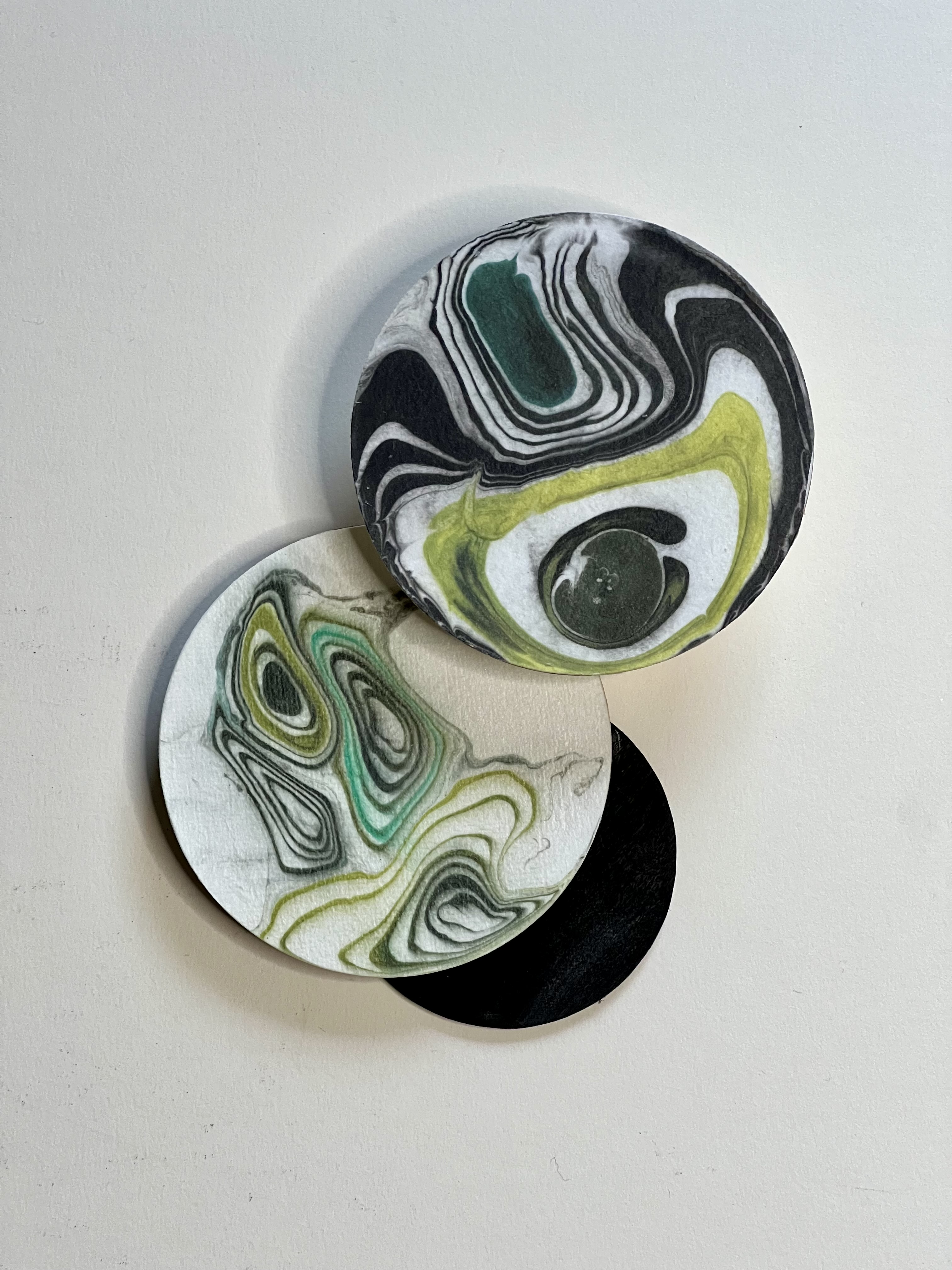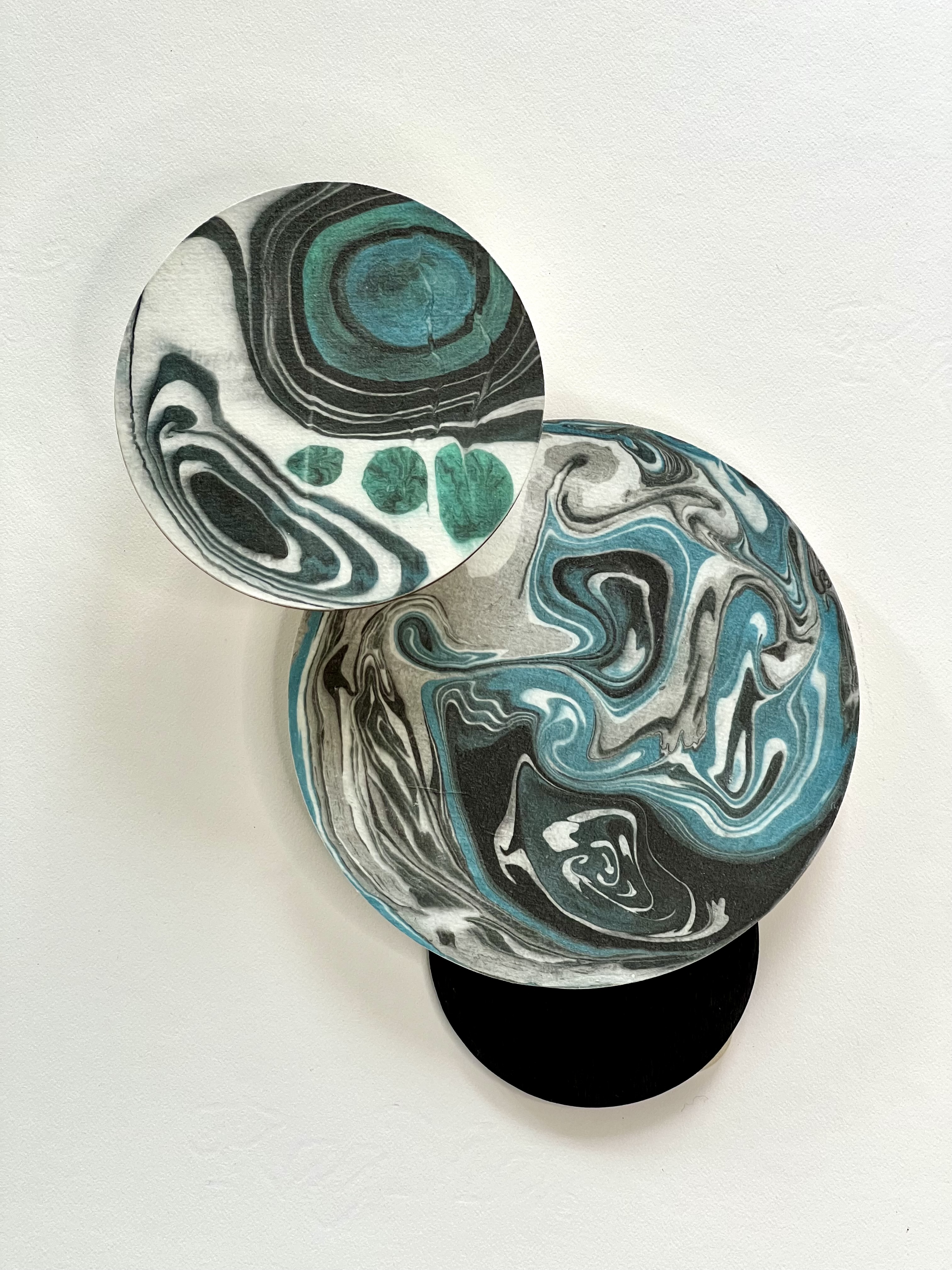 This series of ink monotypes, taken from the surface of rainwater, explore the internal tension one experiences when simultaneously trying to hold on and let go in the face of change. Ink patterns are formed on the water’s surface by the opposing force of cohesive water molecules trying to stay together while a surfactant pulls them apart. I use a mindfulness technique that requires stillness of body and breath to keep the patterns from drifting out of control.