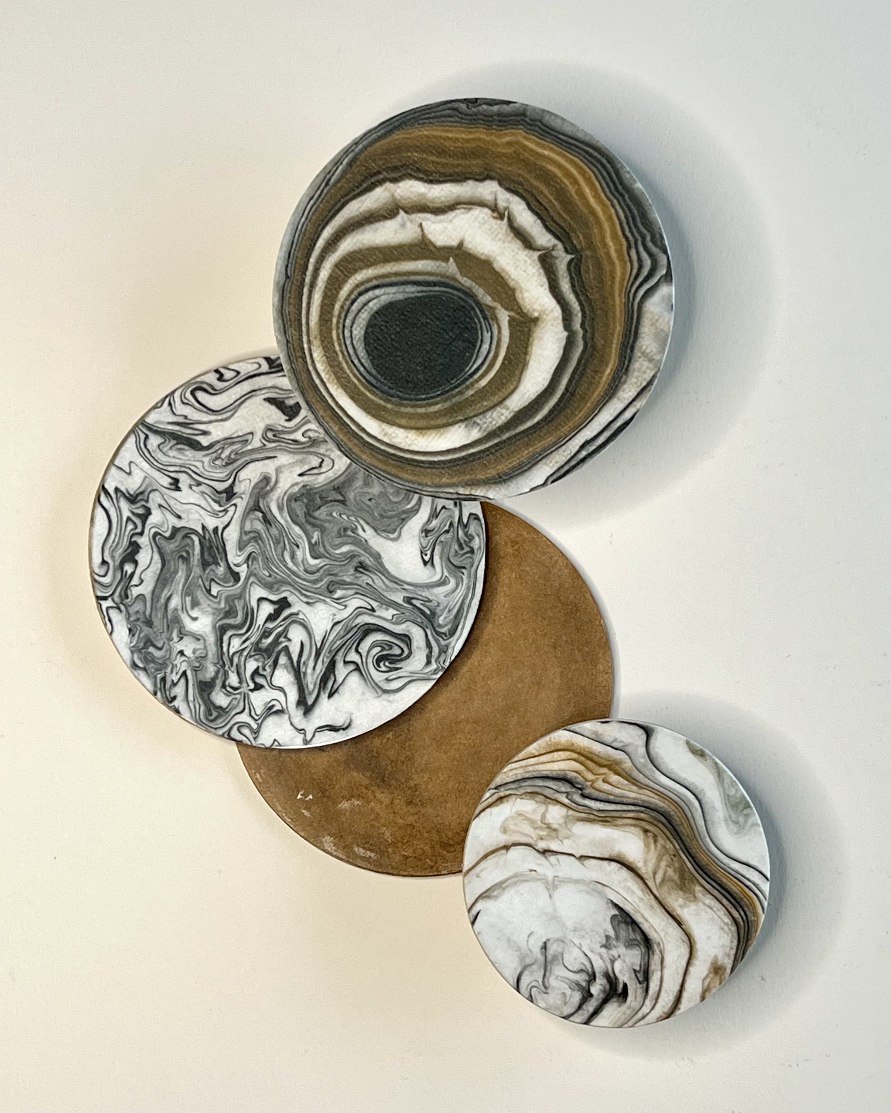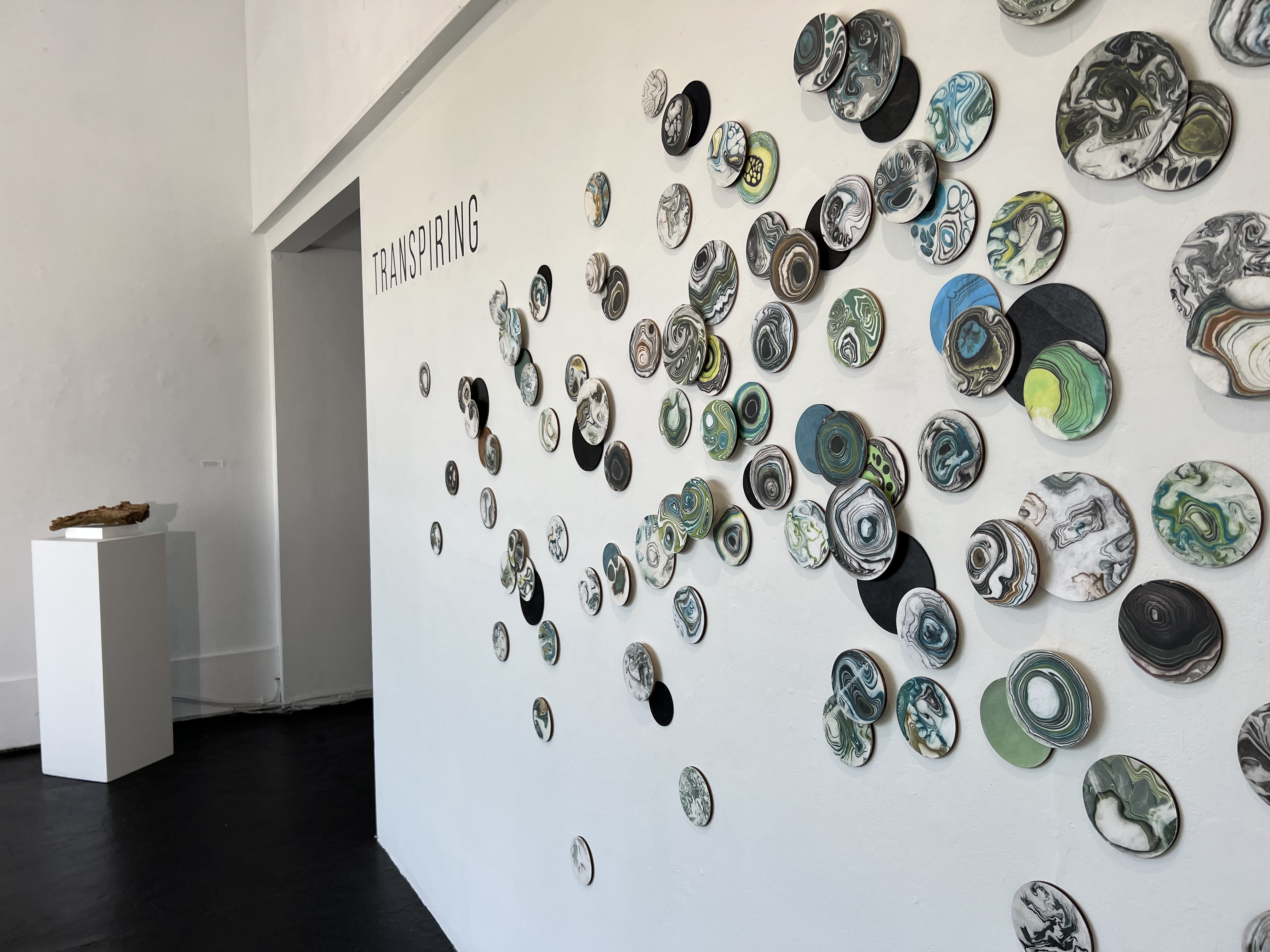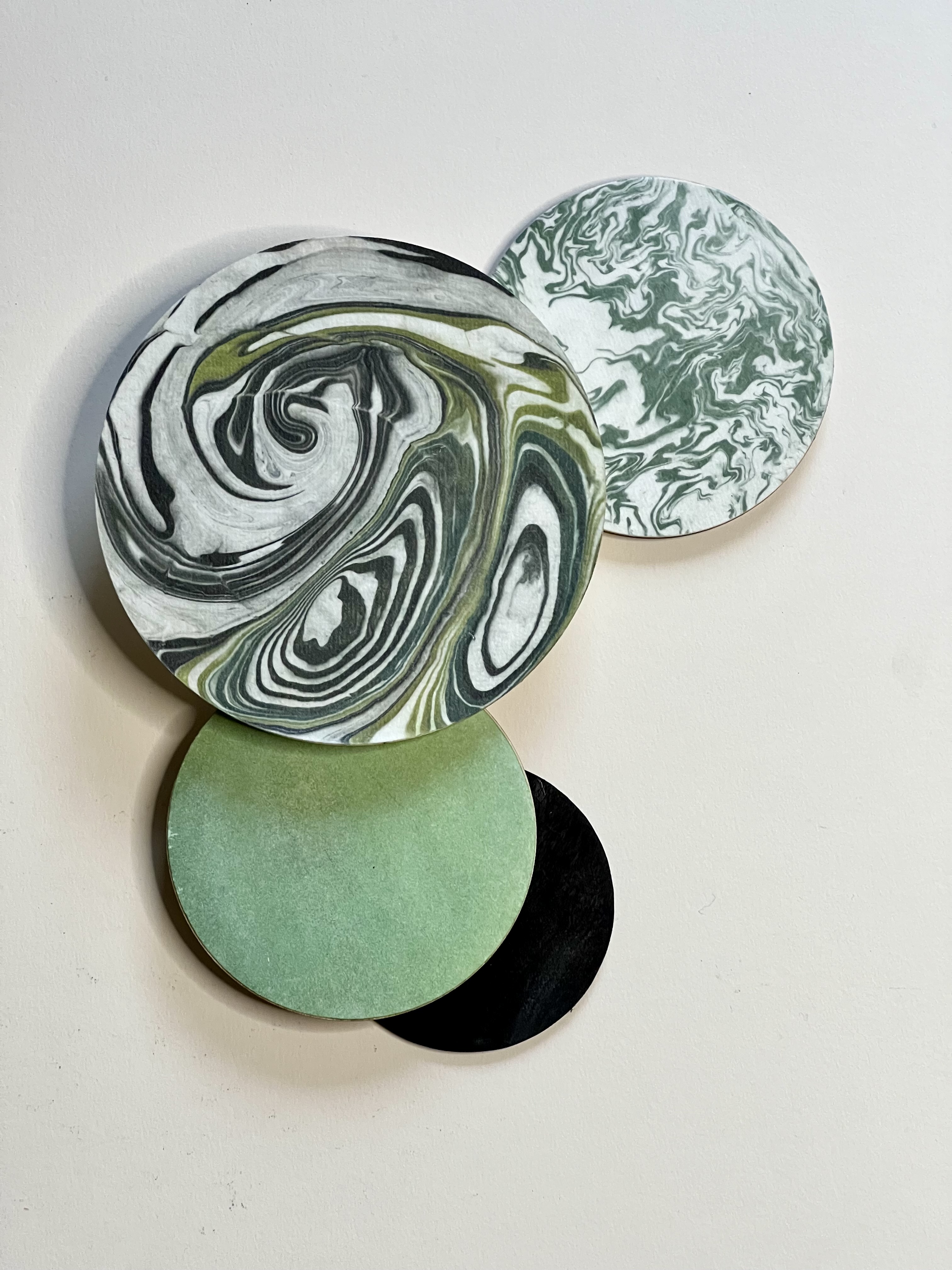 This series of ink monotypes, taken from the surface of rainwater, explore the internal tension one experiences when simultaneously trying to hold on and let go in the face of change. Ink patterns are formed on the water’s surface by the opposing force of cohesive water molecules trying to stay together while a surfactant pulls them apart. I use a mindfulness technique that requires stillness of body and breath to keep the patterns from drifting out of control.