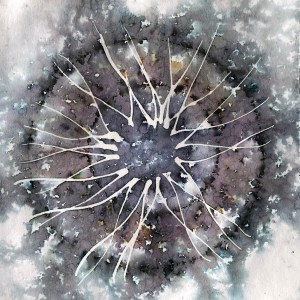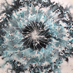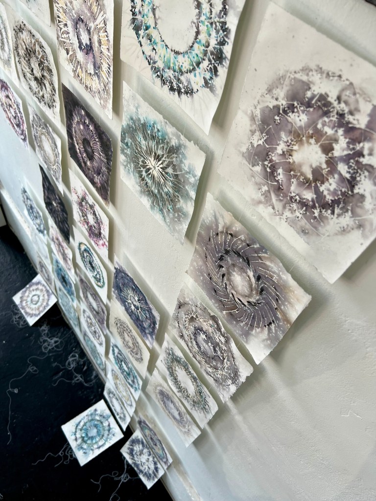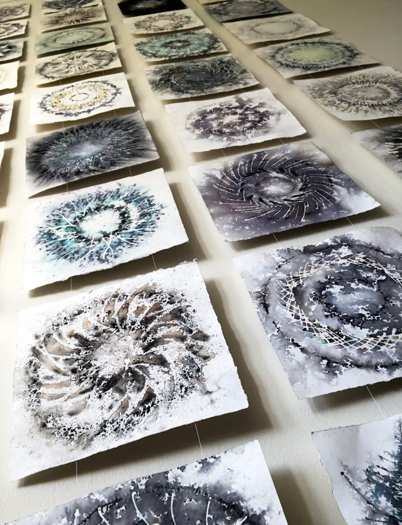 ‘Rain paintings’ reference the movement of rainwater through the interior of a plant and its escape as vapour. The installation piece includes over 60 studies that explore the internal process of letting go.